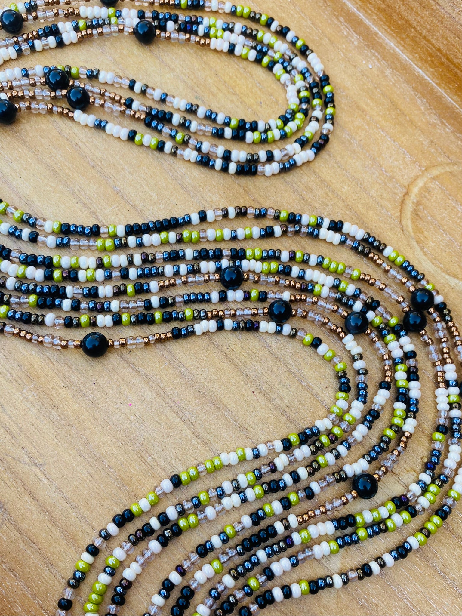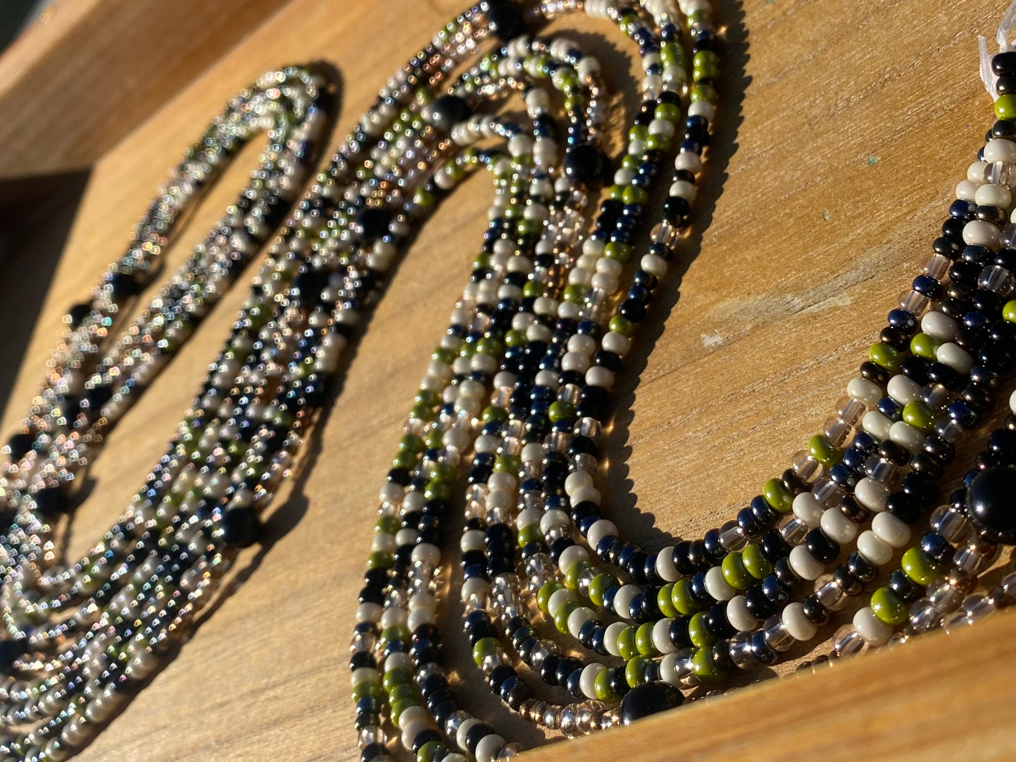 Protect(HER) is a stunning blend of green, black, beige, taupe and bronze beading. She features black obsidian gemstones for protection and grounding. This strand is the perfect tool for renewal and deep-set healing.